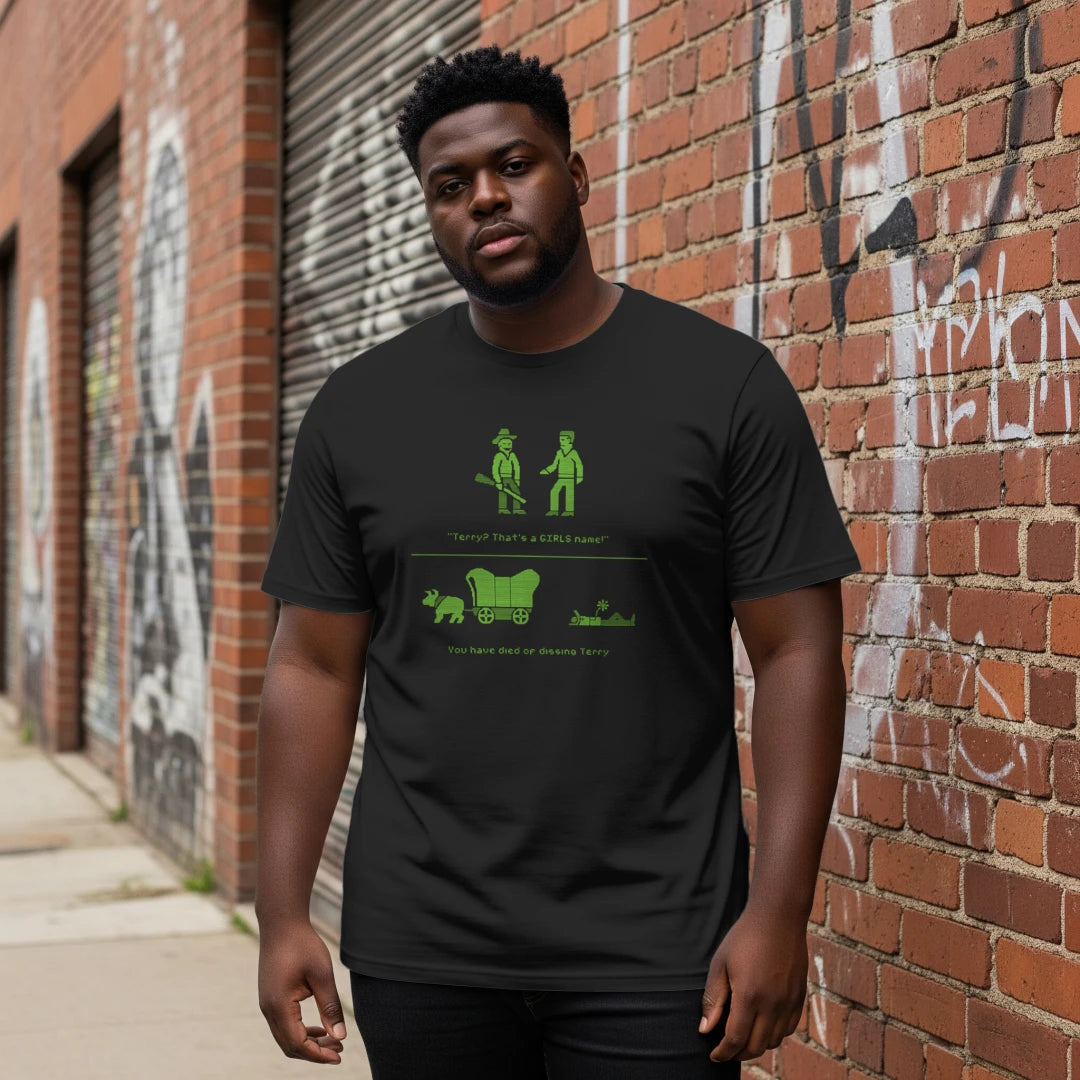 Think you’re brave enough to mock the name Terry? Think again, trailblazer. This retro pixel-art tee pays homage to the legendary Oregon Trail and the even more legendary wrath of Terry. One moment you’re talking smack, the next you’re face-down in the dirt with a flower growing out of your regrets.