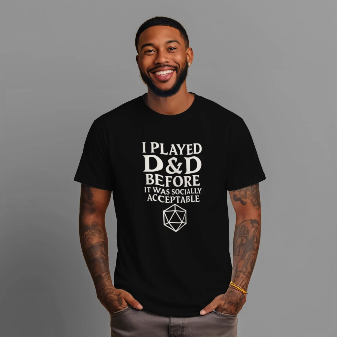 Rep your tabletop roots with this bold, minimalist tee. Featuring ancient-style lettering and a clean d20 outline, it declares: “I played D&D BEFORE it was socially acceptable.”